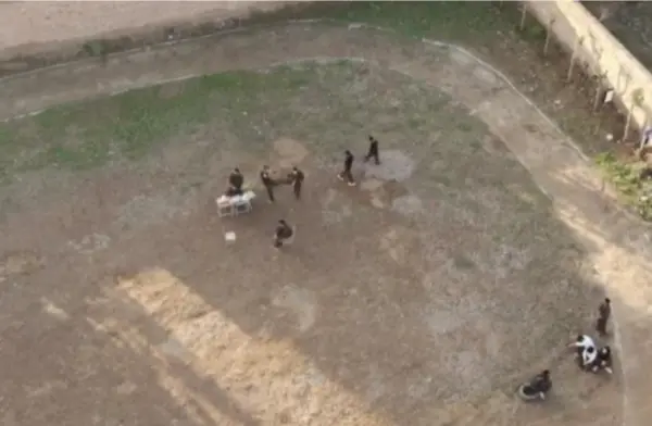 Φωτογραφία που τράβηξε ο Zhu Xinhai με ένα drone που έστειλε πάνω από το σωφρονιστικό σχολείο στη Βάση Εκπαίδευσης Νέων της Σι’αν, γύρω στον Νοέμβριο του 2020, στην οποία διακρίνεται εκπαιδευτής να κλωτσάει έναν μαθητή στο στομάχι. (Zhu Xinhai)