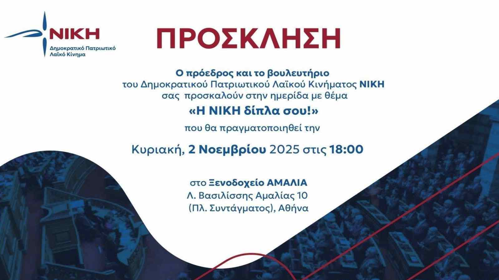 Η ΝΙΚΗ σας προσκαλεί στην εκδήλωση με θέμα «Η ΝΙΚΗ δίπλα σου», που θα πραγματοποιηθεί την Κυριακή, 2 Νοεμβρίου 2025 και ώρα 18:00, στο Ξενοδοχείο ΑΜΑΛΙΑ (Λ. Αμαλίας 10, Πλατεία Συντάγματος, Αθήνα).