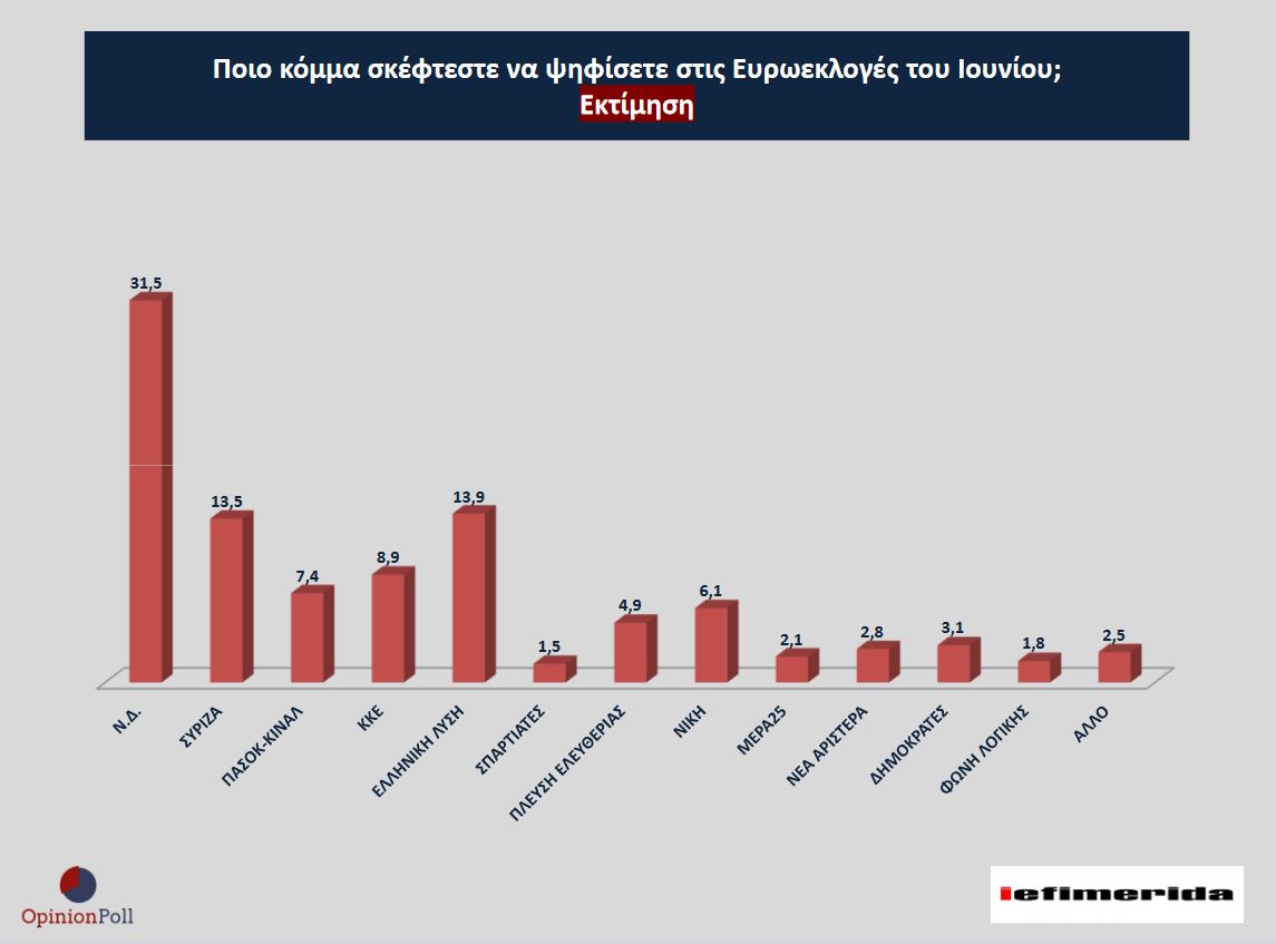 Πιο χαμηλά, έπονται η Ελληνική Λύση (6,8%), η Πλεύση Ελευθερίας (4,9%), η Νίκη (3,5%) και η Νέα Αριστερά (3,2%). Οι υπόλοιποι κομματικοί σχηματισμοί, μεταξύ των οποίων το ΜέΡΑ 25 του Γιάνη Βαρουφάκη και οι Δημοκράτες του Ανδρέα Λοβέρδου αδυνατούν να «πιάσουν» καταγραφή άνω του 3%.