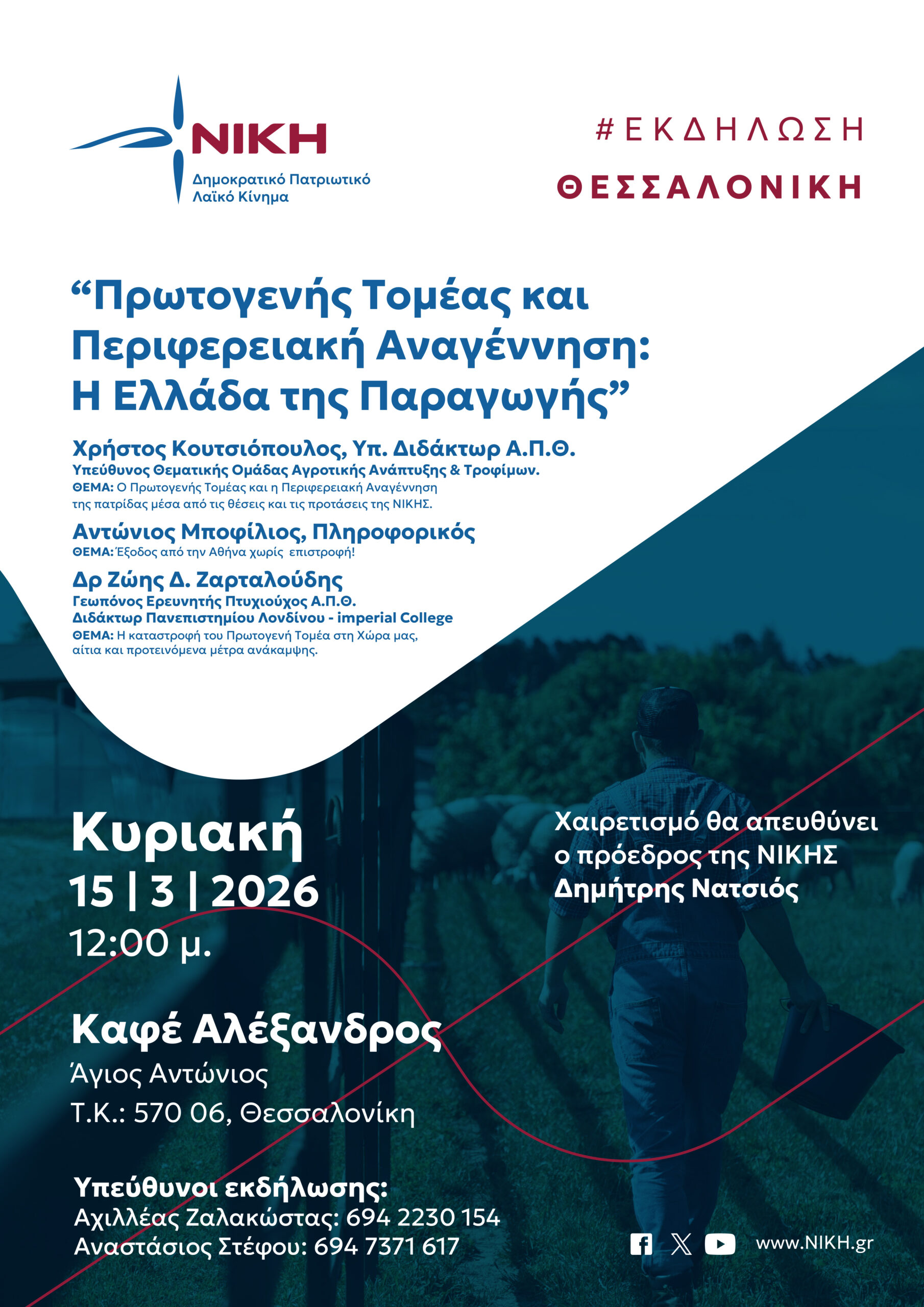 Το Δημοκρατικό Πατριωτικό Λαϊκό Κίνημα ΝΙΚΗ προσκαλεί τους πολίτες σε εκδήλωση – συζήτηση με θέμα «Πρωτογενής Τομέας και Περιφερειακή Αναγέννηση: Η Ελλάδα της Παραγωγής», η οποία θα πραγματοποιηθεί την Κυριακή 15 Μαρτίου 2026 στις 12:00 μ.μ. στο Καφέ Αλέξανδρος, στον Άγιο Αντώνιο Θεσσαλονίκης.