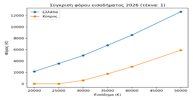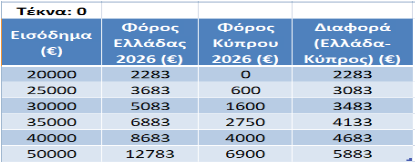 Παρακάτω πίνακες και διαγράμματα σύγκρισης με τον φόρο Ελλάδας και Κύπρου που ισχύει για το 2026 χωρίς τέκνα, με ένα τέκνο και με δυο τέκνα.