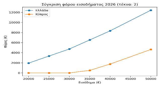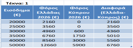 - Στα εισοδήματα € 20.000 – 30.000 η Κύπρος φορολογεί από 0 έως € 1.600, ενώ η Ελλάδα από περίπου € 2.300 έως άνω των € 4.000