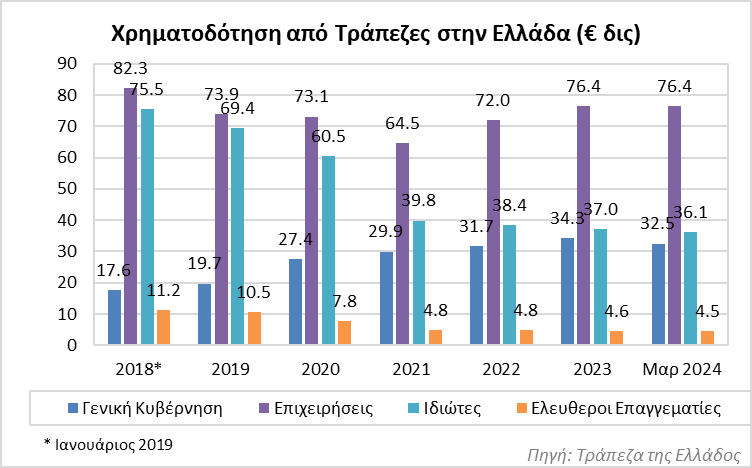 Ακόμη χειρότερα, το δημόσιο αυξάνει συνεχώς τον τραπεζικό δανεισμό του, από 17,6 δις € το 2018, στα 32,5 δις € το 2024 – ενώ οι τράπεζες μειώνουν το δανεισμό των επιχειρήσεων, των νοικοκυριών και των ελευθέρων επαγγελματιών που ληστεύονται επί πλέον από τα νέα τεκμήρια κερδοφορίας και από τη σύνδεση των POS με τις ταμειακές μηχανές που δεν υπάρχει πουθενά στον πλανήτη. Έτσι οι τράπεζες στραγγαλίζουν την οικονομία μας και φυσικά τους Έλληνες, παρά το ότι τα κέρδη τους το 2022 και το 2023 ήταν της τάξης των 7,2 δις € – λόγω των ληστρικών προμηθειών που χρεώνουν, των μηδενικών σχεδόν επιτοκίων καταθέσεων και των υπέρογκων επιτοκίων χορηγήσεων, με την ανοχή της κυβέρνησης