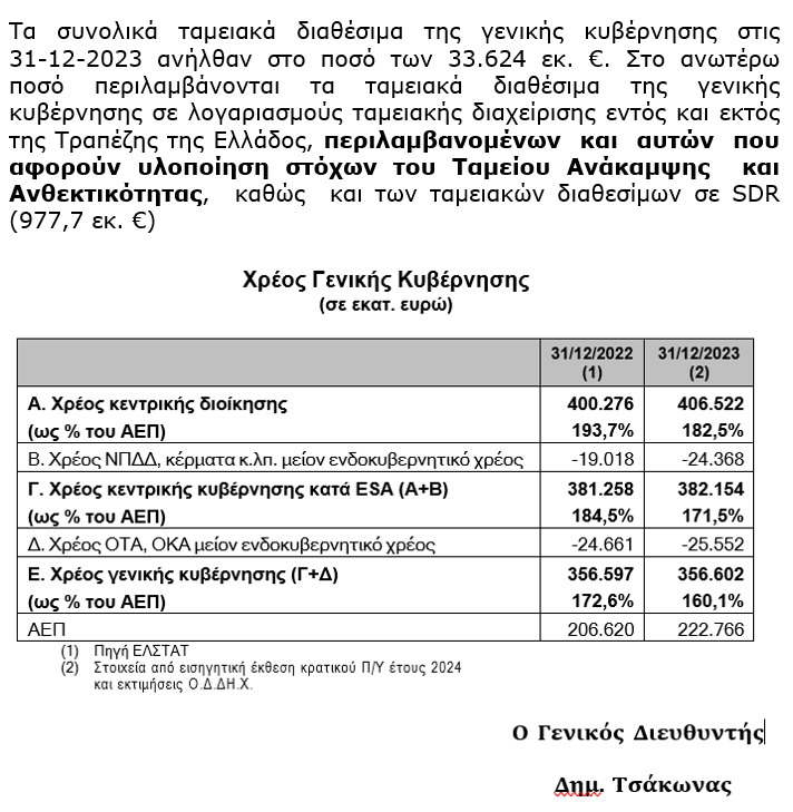 (α) Στα ταμειακά διαθέσιμα που έλεγε στο παρελθόν ότι προέρχονταν από το μαξιλάρι των 15,7 δις € συν τα χρήματα των οργανισμών του δημοσίου που καταθέτονται υποχρεωτικά στην ΤτΕ, συμπεριλαμβάνονται σήμερα τα χρήματα του Ταμείου Ανάκαμψης – οπότε αυτός είναι ο λόγος που τα εισπράττει μεν από την ΕΕ (14,9 δις € όπως δηλώνει η κυβέρνηση), αλλά δίνει ελάχιστα στις επιχειρήσεις και συνεχίζει να πληρώνει μετά από ένα χρόνο τους κατασκευαστές δημοσίων έργων και όχι μόνο, όπως κατήγγειλε ο κ. Περιστέρης.