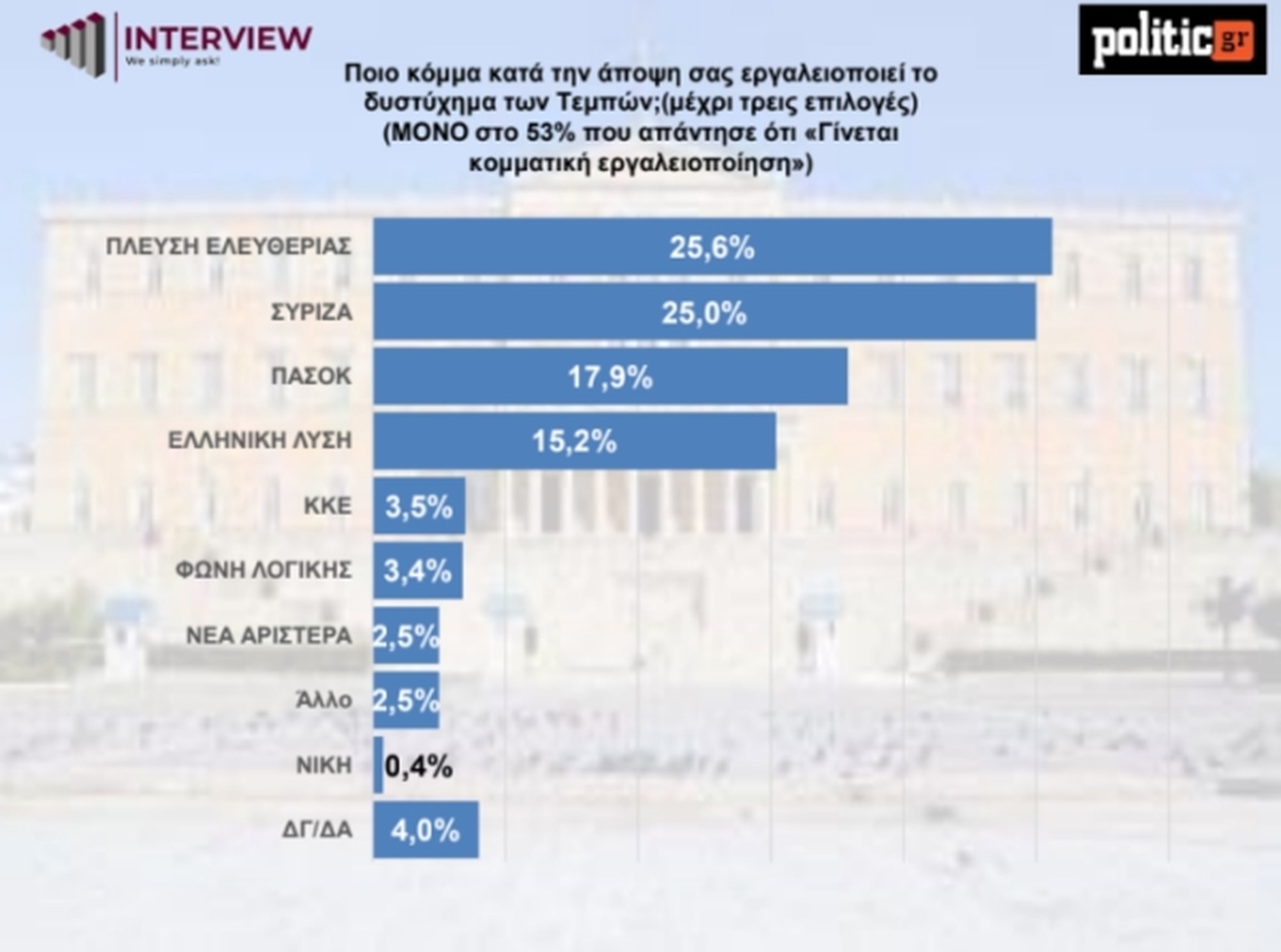 Διχαστικό είναι το ζήτημα της “εργαλειοποίησης” της τραγωδίας των Τεμπών καθώς οι απαντήσεις είναι σχεδόν ισομοιρασμένες. Το 53% πιστεύει ότι γίνεται κομματική εργαλειοποίηση του δυστυχήματος των Τεμπών, ενώ το 44% διαφωνεί. Σύμφωνα με το 53% που θεωρεί ότι γίνεται πολιτική στρατηγική διαχείρισης του θέματος, η Πλεύση Ελευθερίας καταγράφεται πρώτη με 25,6%, ο ΣΥΡΙΖΑ δεύτερος με 25%, ενώ ακολουθούν το ΠΑΣΟΚ με 17,9% και η Ελληνική Λύση με 15,2%.